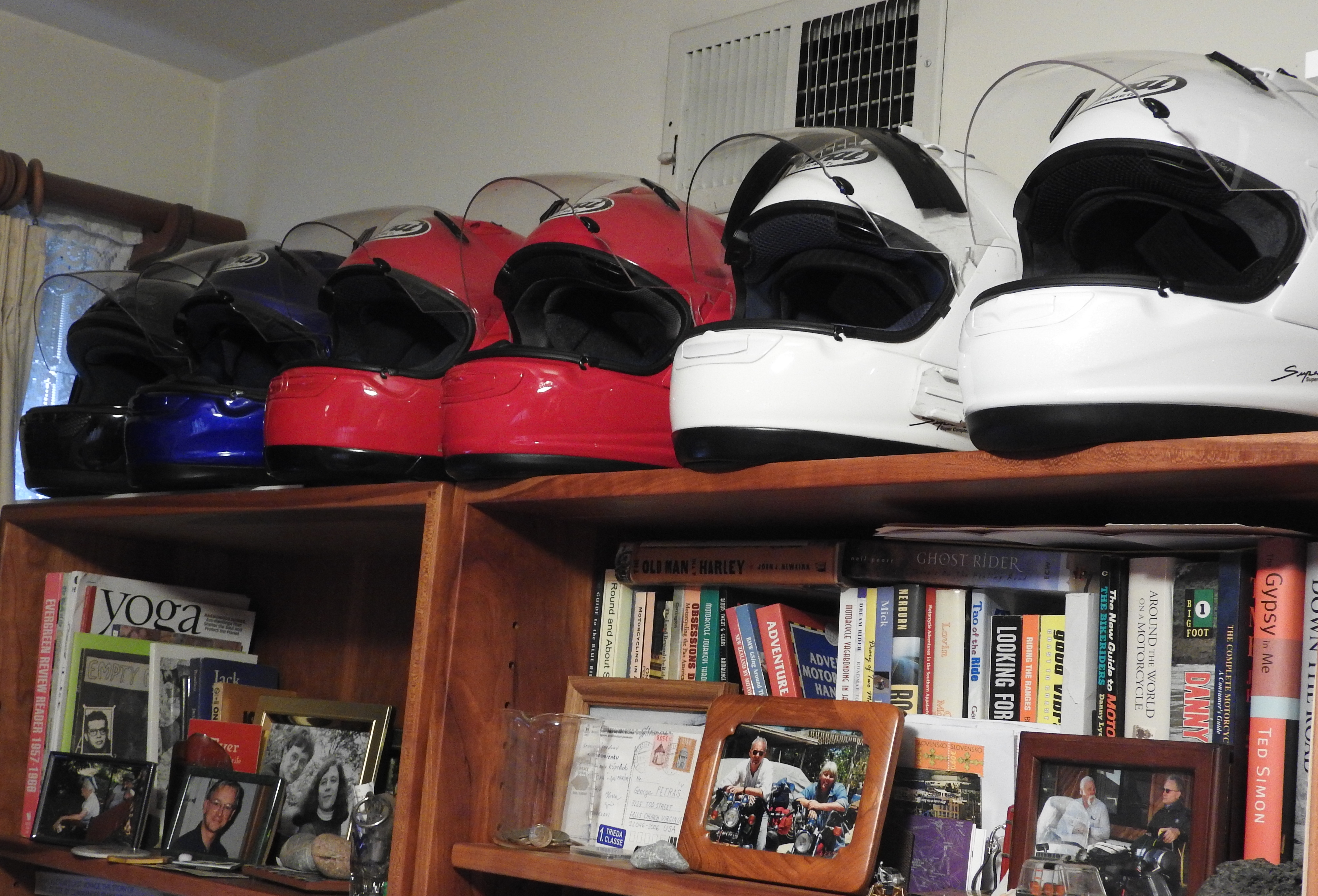 We see a couple of cats roaming about the parking lot as we arrive. Otherwise, it’s pretty quiet. Linda checks us in, and I start moving bags from the car to the room. Then I open the Vespa’s saddle and take a few things, notebooks and spare gloves and such, from the carrier.